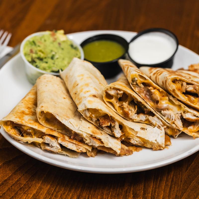 Flour tortillas filled with melted cheddar cheese, homemade beans, guacamole, jalapenos and sour cream. Your choice of: grilled chicken, roast beef or vegetarian. Shrimp or steak is available for an additional charge.