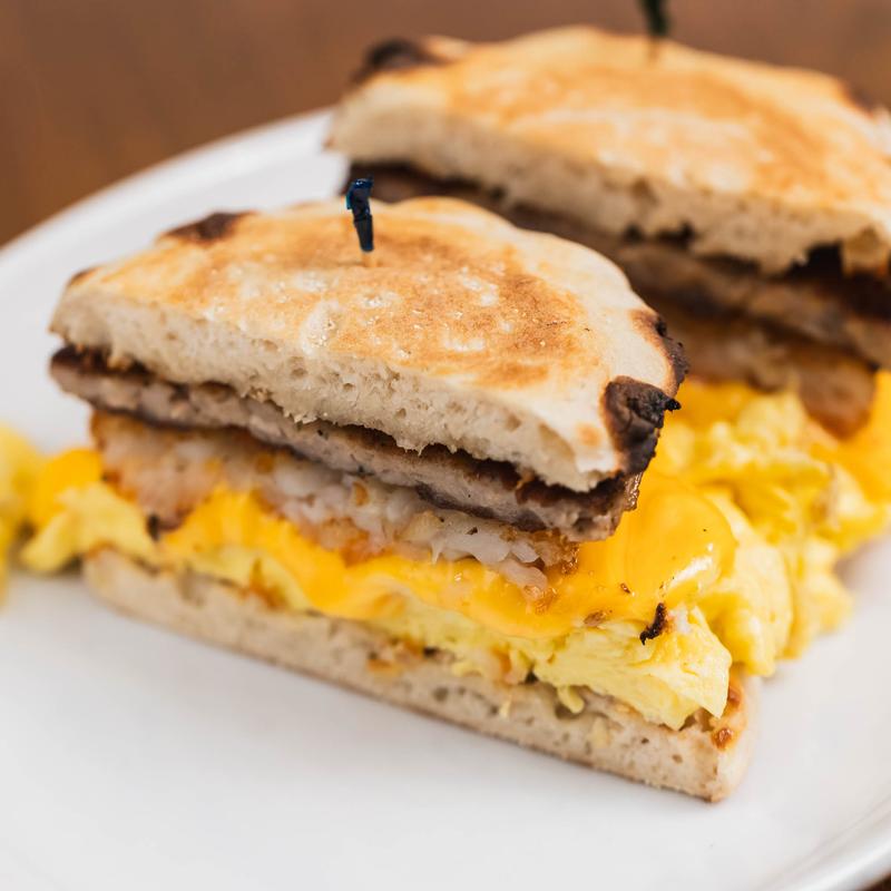 2 scramble eggs, sausage, cheese, red onion, hashbrowns, chipotle mayo on a roll.