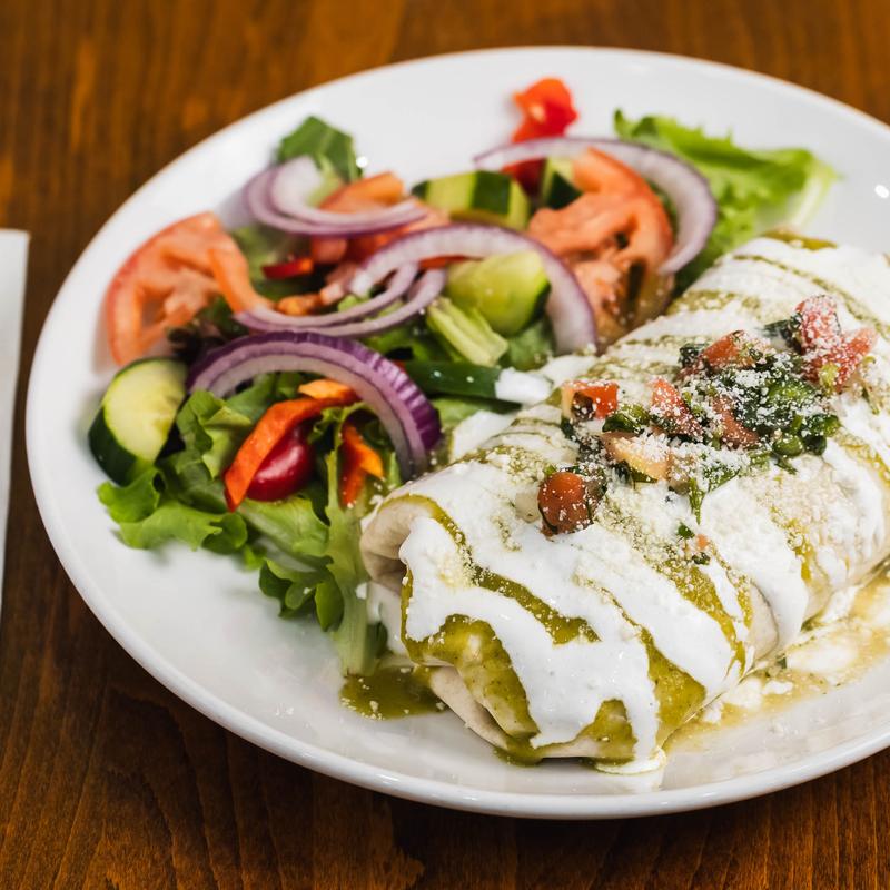 Flour tortilla filled with guacamole, rice, sour cream, homemade beans and pico de gallo, and Cotija cheese served with mixed greens salad, tomato, cucumbers and red onions. Choice of grilled chicken, roast beef, vegetarian, Mexican sausage, al pastor, carne asada or carnitas and salsa verde. Shrimp, steak burrito or fish available for an additional charge.